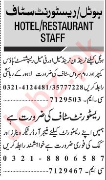 Restaurant jobs advertisement dated about 13 February 2023 in daily Jang Newspaper invites application for the vacant post of waiter, order taker, restaurant staff, manager, house keeper, female receptionist, room service staff, receptionist, restaurant manager and cook in Lahore, lahore Punjab Pakistan. Candidates with Matric, Intermediate, Middle and Bachelor etc. educational background will be preferred.