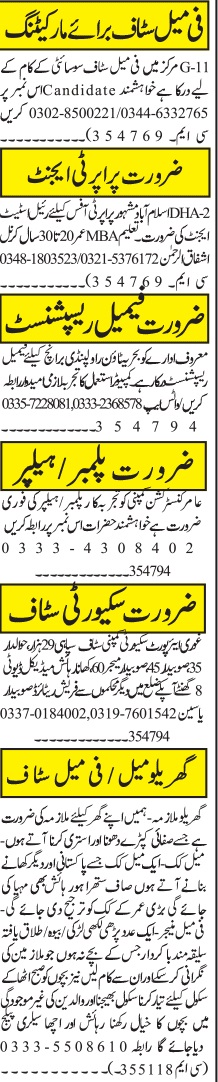 Private Company Rawalpindi, islamabad Punjab Pakistan invites applications from eligible candidates for the post of helper, chef, marketing officer, house worker, security guard, security staff, marketing staff, property agent, female receptionist, plumber, receptionist and cook as per advertisement of June 13, 2022 published in daily Jang Newspaper. Educational qualifications required Matric, Bachelor, Middle and Intermediate etc.