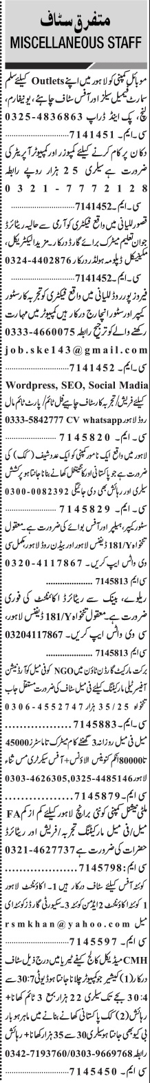 Vacant posts including office boy, chef, store incharge, mechanical diploma holder, social media officer, marketing staff, office staff, sales staff, computer operator, store keeper, seo, security guard, electrical diploma holder, female coordination officer, helper, accountant, admin officer, cook, composer, telemarketing officer, guard and cashier are announced in Private Company Lahore, quetta and lahore Punjab Pakistan as per 12 May 2024 advertisement in daily Jang Newspaper. Persons with B.com, Intermediate, BA, Bachelor, Middle, I.com and Matric etc. education can apply.