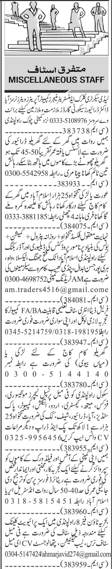 Private Company Islamabad, hassan abdal, wah cantt, attock, rawalpindi, fateh jang, taxila and haripur Islamabad Pakistan invites applications from eligible candidates for the post of lab technician, clerk, administrator, pak studies teacher, montessori teacher, data entry staff, nurse, physics teacher, husband wife, chemistry teacher, security guard, staff nurse, pathologist, supervisor, order booker, english teacher, manager, delivery officer, waiter, mathematics teacher, lady secretary, cook, teacher, aya, chef, principal, computer operator, computer teacher, house servant, doctor, urdu teacher, house driver and driver as per advertisement of May 12, 2024 published in daily Jang Newspaper. Educational qualifications required Bachelor, BA, Others, Matric, Intermediate, MBBS and Middle etc.