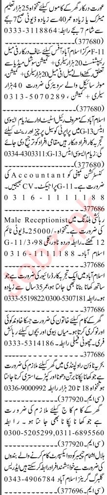 Private Company Islamabad, rawalpindi Islamabad Pakistan invites applications from eligible candidates for the post of surveyor, husband wife, house worker, real estate agent, driver, male receptionist, maid, accountant, receptionist, masi and social media expert as per advertisement of November 12, 2023 published in daily Jang Newspaper. Persons with Bachelor, I.com, BA, Middle, Matric, Intermediate and B.com etc. education can apply.