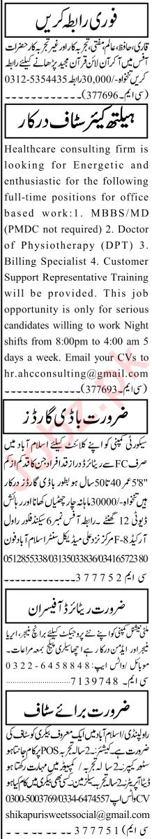 Private Company jobs advertisement dated about 12 November 2023 in daily Jang Newspaper invites application for the vacant post of data entry operator, qari, doctor of physical therapy, body guard, quran teacher, csr, doctor, teacher, customer support representative, cashier, admin manager, hafiz, mbbs doctor, store keeper, billing specialist, area manager, salesman and branch manager in Islamabad, rawalpindi Islamabad Pakistan. Educational qualifications required Bachelor, Matric, Middle, BA, B.com, Intermediate and I.com etc.