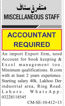 Import Export Company jobs advertisement dated about 13 October 2025 in daily Jang Newspaper invites application for the vacant post of accountant and accounts officer in Lahore, lahore Punjab Pakistan. Preferred Education is Others, Bachelor and B.com etc.