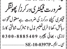 Factory invites applications for job positions advertised in daily Jang dated 13 October 2025 for following vacancies in Lahore, lahore Punjab Pakistan.