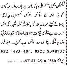 Vacant posts including chemistry teacher, science teacher, physics teacher, teacher and biology teacher are announced in Laycens School System LSS Bedian Road Lahore, lahore Punjab Pakistan as per 13 October 2025 advertisement in daily Jang Newspaper. Preferred Education is MA, Master, BA, M.sc and Bachelor etc.