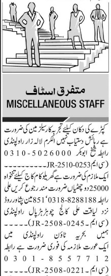Private Company jobs advertisement dated about 13 October 2025 in daily Jang Newspaper invites application for the vacant post of house maid, salesman, aya, masi, maid and house worker in Lalazar Rawalpindi, rawalpindi Punjab Pakistan. Primary, Middle, Matric and Intermediate etc. educational qualification will be preferred.