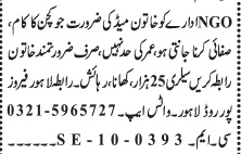 Non Governmental Organization NGO is looking for candidates for following posts as per job advertisement published in daily Jang Newspaper of October 13, 2025 for location Ferozepur Road Lahore, lahore Punjab Pakistan: