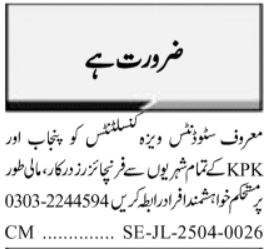 Education Visa Consultancy Firm jobs advertisement dated about 14 April 2025 in daily Jang Newspaper invites application for the vacant post of franchiser and distributor in Multan, multan Punjab Pakistan. Persons with Intermediate and Matric etc. education can apply.