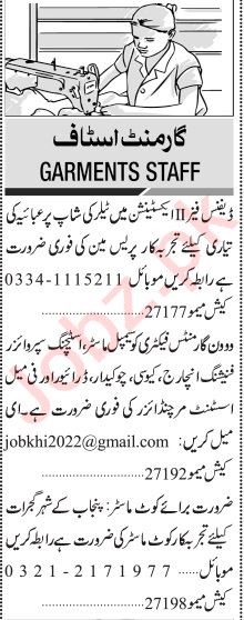 Garments Factory Karachi, karachi Sindh Pakistan invites applications from eligible candidates for the post of press man, finishing incharge, driver, female assistant, assistant merchandiser, quality controller, tailor, coat master, stitching supervisor, chowkidar and sample master as per advertisement of August 14, 2023 published in daily Jang Newspaper. Persons with Intermediate, Bachelor and Matric etc. education can apply.