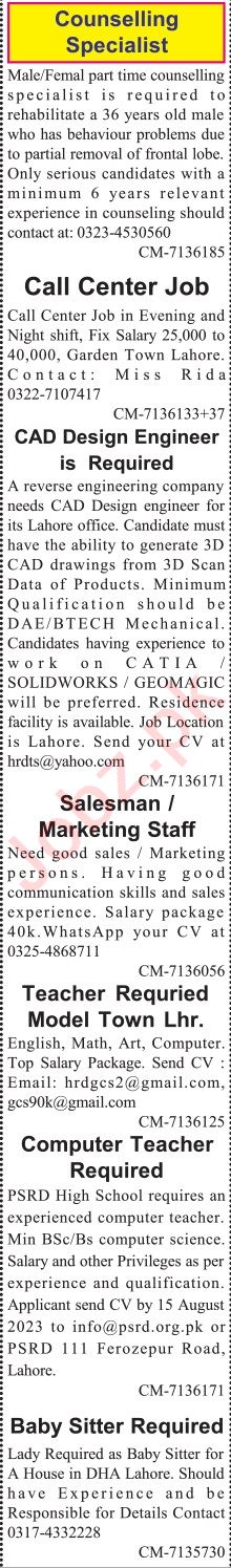 Private Company Lahore, lahore Punjab Pakistan invites applications from eligible candidates for the post of art teacher, salesman, counselling specialist, mechanical engineer, call center agent, marketing staff, baby sitter, english teacher, teacher, math teacher, cad design engineer and computer teacher as per advertisement of August 15, 2023 published in daily Jang Newspaper. Middle, M.sc, Intermediate, Bachelor, BA, MA, B.com and Matric etc. educational qualification will be preferred.