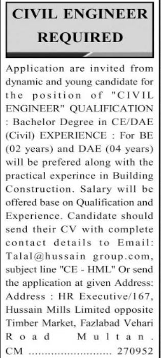 Hussain Group of Companies invites applications for job positions advertised in daily Jang dated 13 February 2022 for following vacancies in Multan Punjab Pakistan.