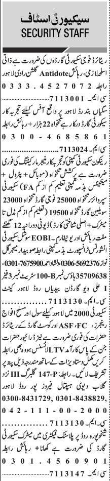 Security Company is looking for candidates for following posts as per job advertisement published in daily Jang Newspaper of February 13, 2022 for location Lahore Punjab Pakistan: