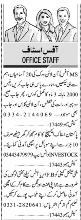 Educational qualifications required Middle, Bachelor, Matric and Intermediate etc.