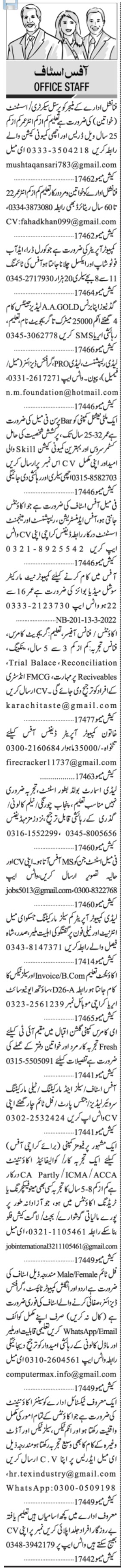 Vacant posts including assistant, marketing staff, telemarketing officer, public relation officer, personal secretary, computer net marketer, female computer operator, accountant, female office staff, computer operator, sales staff, female assistant, lady receptionist, accounts officer, graphic designer, surveyor, management assistant, typist, receptionist, social media boys, finance officer and pro are announced in Private Company Karachi, karachi Sindh Pakistan as per 14 March 2022 advertisement in daily Jang Newspaper. Educational qualifications required Bachelor, Middle, Matric and Intermediate etc.