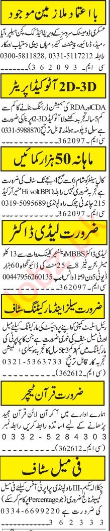 Private Company jobs advertisement dated about 14 November 2022 in daily Jang Newspaper invites application for the vacant post of real estate agent, autocad operator, aya, cook, sales officer, doctor, quran teacher, maid, teacher, call center agent, patient care, sales staff, lady doctor, driver, marketing officer, mbbs doctor, husband wife, marketing staff and kitchen helper in Islamabad, islamabad Islamabad Pakistan. Intermediate, Bachelor, Middle and Matric etc. educational qualification will be preferred.