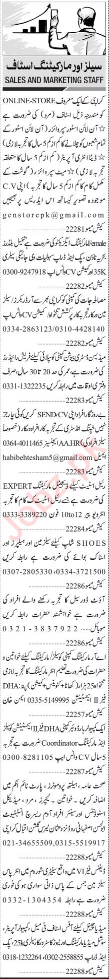 Jang Sunday Classified Ads 13 Nov 2022 for Sales Staff