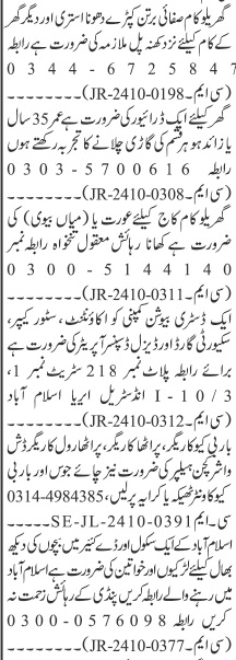 Vacant posts including ltv driver, kitchen helper, accountant, security guard, dishwasher, aya, house worker, diesel dispenser operator, bar bq cook, nanny, husband wife, driver, store keeper, maid and masi are announced in Private Company Islamabad, rawalpindi Islamabad Pakistan as per 14 October 2024 advertisement in daily Jang Newspaper. B.com, BA, Intermediate, Bachelor, Matric and Middle etc. educational qualification will be preferred.
