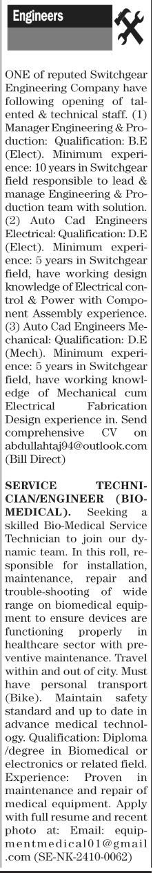 Engineering Company Karachi, karachi Sindh Pakistan invites applications from eligible candidates for the post of mechanical engineer, electronics engineer, autocad engineer, manager production, biomedical engineer, manager engineering, service technician and electrical engineer as per advertisement of October 14, 2024 published in daily Jang Newspaper. Educational qualifications required DAE, Bachelor, Intermediate, Matric and B.E etc.