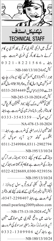 Jang Sunday Classified Ads 13 Oct 2024 For Factory Staff