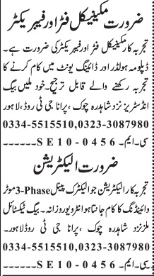 Private Industry Lahore, lahore Punjab Pakistan invites applications from eligible candidates for the post of diploma holder, fabricator, motor winder, electrician and mechanical fitter as per advertisement of October 14, 2024 published in daily Jang Newspaper. Preferred Education is DAE, Matric and Intermediate etc.