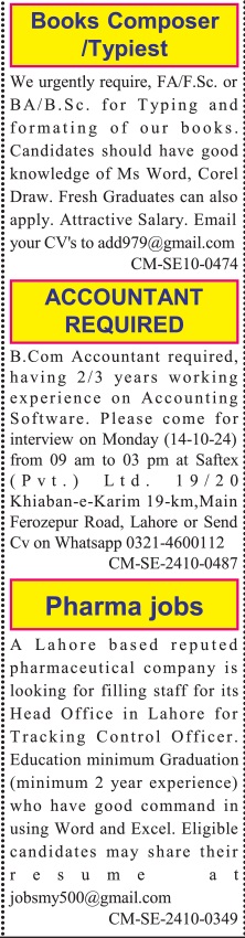 Private Company jobs advertisement dated about 14 October 2024 in daily Jang Newspaper invites application for the vacant post of tracking control officer, typist, accountant, filling staff and book composer in Lahore, lahore Punjab Pakistan. Candidates with BA, Bachelor and Intermediate etc. educational background will be preferred.