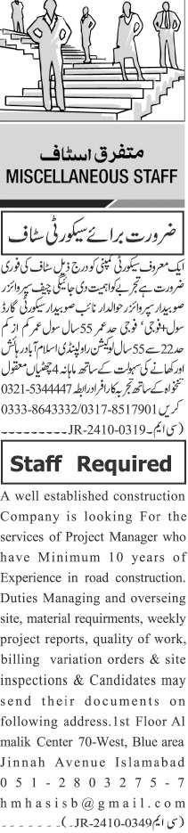 Private Company jobs advertisement dated about 14 October 2024 in daily Jang Newspaper invites application for the vacant post of project manager, naib subedar, subedar, supervisor, civil guard, chief supervisor, fauji guard, security staff, havaldar and security guard in Islamabad, rawalpindi Islamabad Pakistan. Educational qualifications required BA, Matric, Bachelor, Middle and Intermediate etc.