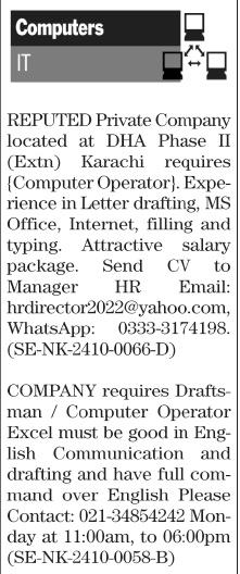 IT Company jobs advertisement dated about 14 October 2024 in daily Jang Newspaper invites application for the vacant post of draftsman and computer operator in Karachi, karachi Sindh Pakistan. Candidates with BA and Bachelor etc. educational background will be preferred.