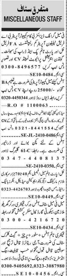 Private Company Lahore, lahore Punjab Pakistan invites applications from eligible candidates for the post of house worker, purchaser, bike rider, marketing executive, accounts staff, driver, banker, security guard, computer operator, receptionist, office worker, kitchen boy, store keeper, graphic designer, gate clerk, telephone operator and factory worker as per advertisement of October 14, 2024 published in daily Jang Newspaper. Persons with Intermediate, Middle, Matric, BA and Bachelor etc. education can apply.