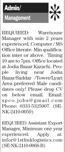 Private Company Karachi, karachi Sindh Pakistan invites applications from eligible candidates for the post of assistant export manager and warehouse manager as per advertisement of October 14, 2024 published in daily The News Newspaper. Preferred Education is BA and Bachelor etc.