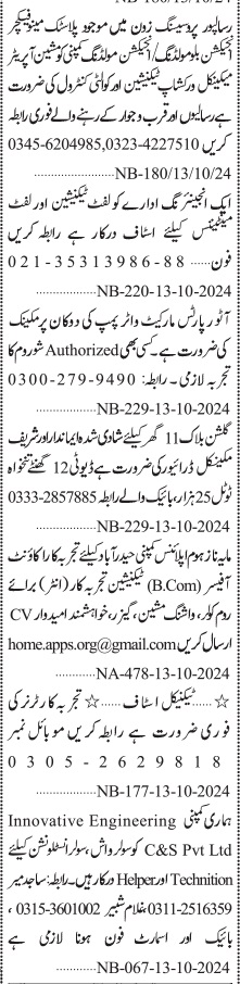 Manufacturing Company Karachi, karachi Sindh Pakistan invites applications from eligible candidates for the post of mechanical driver, mechanic, helper, machine operator, injection blow molding machine operator, turner, quality control officer, technical staff, mechanical workshop technician, accounts officer and lift technician as per advertisement of October 14, 2024 published in daily Jang Newspaper. Persons with Matric, Middle, DAE, Bachelor and Intermediate etc. education can apply.