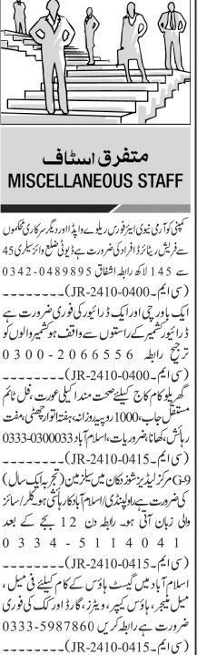 Private Company Islamabad, rawalpindi Islamabad Pakistan invites applications from eligible candidates for the post of house keeper, aya, house maid, masi, cook, female manager, salesman, manager, bawarchi, guard, waiter, office staff, maid and driver as per advertisement of October 14, 2024 published in daily Jang Newspaper. Persons with Matric, Bachelor, BA, Middle and Intermediate etc. education can apply.