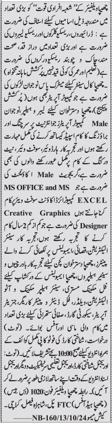 Chhipa Welfare Association jobs advertisement dated about 14 October 2024 in daily Jang Newspaper invites application for the vacant post of painter, creative graphic designer, rescue labor, helper, rescue clerk, mechanic, butcher, generator operator, clerk, computer operator, driver, labor, electrician, masi, auto electrician, cook, rescue worker, welder, sweeper, denter, call center agent, mistri, office boy, helper mechanic and security guard in Karachi, karachi Sindh Pakistan. Candidates with Primary, Matric, Intermediate, Middle, BA and Bachelor etc. educational background will be preferred.