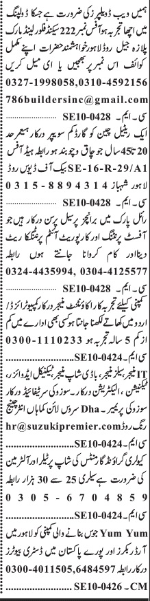 Private Company jobs advertisement dated about 14 October 2024 in daily Jang Newspaper invites application for the vacant post of electrician, web developer, technician, it manager, order booker, tailor, guard, distributor, body shop manager, manager, sweeper, sales person, technical advisor, accountant and sales manager in Lahore, lahore Punjab Pakistan. Bachelor, BBA, Middle, Matric, Intermediate, BA, DAE and B.com etc. educational qualification will be preferred.