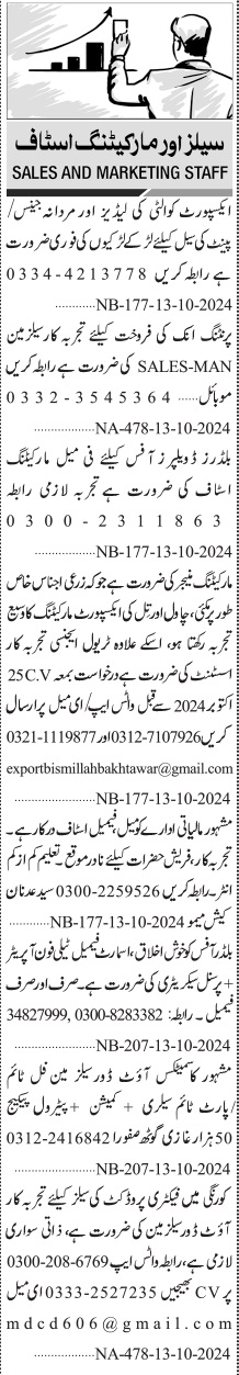 Jang Sunday Classified Ads 13 Oct 2024 For Sales Staff