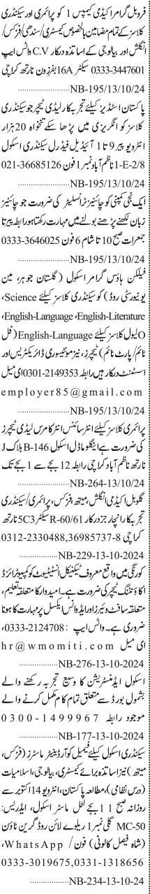 Jang Sunday Classified Ads 13 Oct 2024 For Teachers