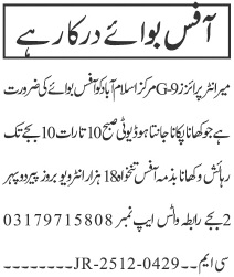 Vacant posts including office boy and office staff are announced in Mir Enterprises Pvt Limited G-9 Islamabad, islamabad Islamabad Pakistan as per 15 December 2025 advertisement in daily Jang Newspaper. Preferred Education is Middle and Matric etc.