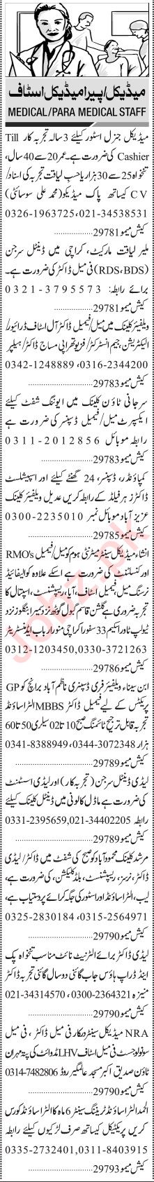 Hospital Clinic jobs advertisement dated about 15 January 2024 in daily Jang Newspaper invites application for the vacant post of gym instructor, gynecologist, lhv, paramedical staff, blood technician, cashier, rmo, till cashier, receptionist, nurse, electrician, mbbs doctor, dispenser, lady assistant, aya, compounder, lady doctor, medical specialist, sonologist, physiotherapist, lady health visitor, dental surgeon, dentist, helper, doctor, medical consultant, driver and resident medical officer in Karachi, karachi Sindh Pakistan. Persons with BDS, Others, B Pharmacy, BA, P.G Diploma, Bachelor, MBBS, Matric, Intermediate and DAE etc. education can apply.