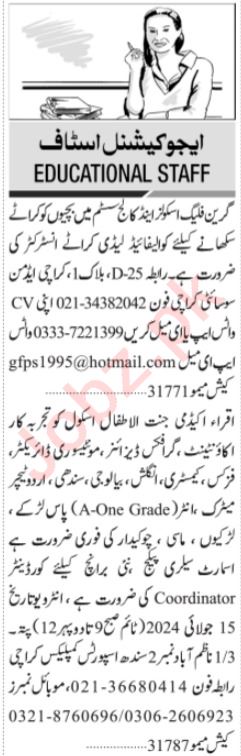 Private School latest Classifieds Education jobs and others can be applied till 30 July 2024 or as per closing date in newspaper ad. Read complete ad online to know how to apply on latest Private School job opportunities. Learn today extra skills including Teaching/Lecturing, Security, Graphic Design, Urdu, Biology, Physics Tutoring, Sports, English Teaching, Chemistry Tutoring, Accounting and Education & Tutoring to get these Private School jobs.