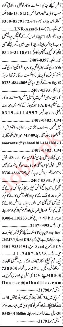 Jang Sunday Classified Ads 14 July 2024 for Office Staff