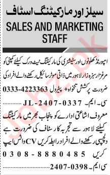 Marketing Company Lahore, lahore Punjab Pakistan invites applications from eligible candidates for the post of marketing officer, sales staff and marketing staff as per advertisement of July 15, 2024 published in daily Jang Newspaper. Educational qualifications required Intermediate, Bachelor and BA etc.