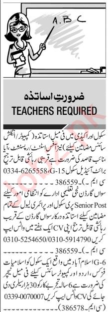 Vacant posts including receptionist, lady teacher, office assistant, physics teacher, primary teacher, aya, naib qasid, preschool teacher, computer teacher, islamiat teacher, urdu teacher, science teacher, computer science teacher, teacher and english teacher are announced in Private School Islamabad, rawalpindi Islamabad Pakistan as per 15 July 2024 advertisement in daily Jang Newspaper. Persons with Bachelor, MA, Master, BA and M.sc etc. education can apply.