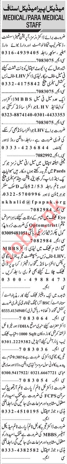 Skin Specialist, Medical Specialist, ENT Specialist, Eye Specialist, Child Specialist, Medical Officer, Radiologist, Nurse, LHV, Doctor, Lady Doctor, Pharmacist, Midwives, Gynecologist, Receptionist, Dispenser, Resident Medical Officer, Pathologist, Assistant Chemist, ICU Technician, CT Scan Technician, X Ray Technician, House Officer, Nursing Instructor, CCTV Assistant, Lab Technician seeks in well known hospitals.