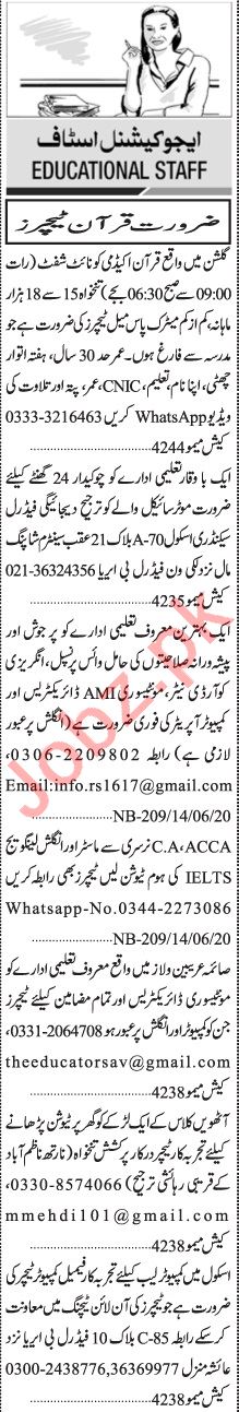 Jang Sunday Classified Ads 14 June 2020 for Teaching Staff