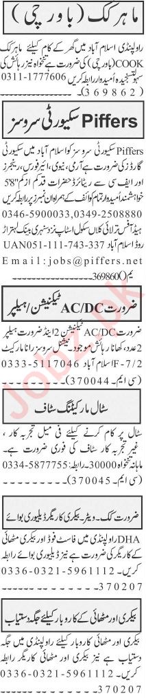 Vacant posts including staff marketing staff, ac technician, security guard, bakery worker, marketing officer, dc technician, chef, helper, cook, delivery boy and waiter are announced in Private Company Islamabad, rawalpindi Islamabad Pakistan as per 15 May 2023 advertisement in daily Jang Newspaper. Preferred Education is Matric, Middle, DAE, Intermediate, Bachelor and BA etc.
