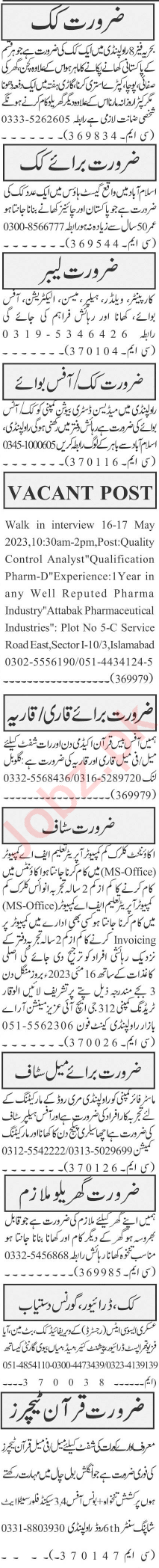 Private Company jobs advertisement dated about 15 May 2023 in daily Jang Newspaper invites application for the vacant post of house worker, chinese cook, accountant, office boy, computer operator, helper staff, qari, cook, physiotherapist, chef, marketing officer, electrician, mason, quran teacher, qariah, carpenter, husband wife, house staff, quality control analyst, labor, clerk, maid, helper, welder, batman, aya and patient care in Islamabad, rawalpindi Islamabad Pakistan. Intermediate, Matric, Pharma D, I.com, Middle, BBA, BA and Bachelor etc. educational qualification will be preferred.
