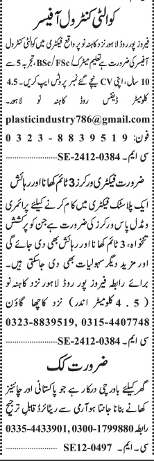 Vacant posts including quality control officer, factory worker, chinese cook, cook and qc officer are announced in Private Company Lahore, lahore Punjab Pakistan as per 16 December 2024 advertisement in daily Jang Newspaper. Educational qualifications required Matric, Middle and Intermediate etc.
