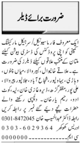 Vacant posts including marketing staff, distributor and dealer are announced in Pharmaceutical Company Multan, khanewal, bahawalpur, vehari, layyah and rahim yar khan Punjab Pakistan as per 16 December 2024 advertisement in daily Jang Newspaper. Persons with Intermediate and Matric etc. education can apply.