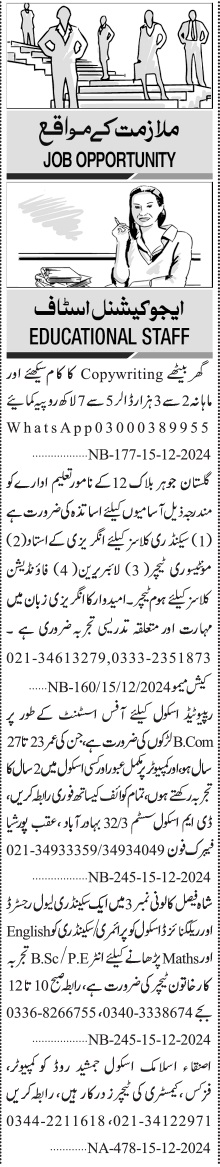Jang Sunday Classified Ads 15 Dec 2024 for Educational Staff
