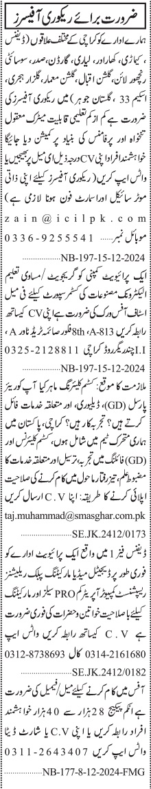 Private Company Karachi, karachi Sindh Pakistan invites applications from eligible candidates for the post of computer operator, customer support officer, digital media marketing officer, marketing officer, office worker, female office staff, recovery officer, sales officer, receptionist, customs clearing officer, office staff, pro and public relations officer as per advertisement of December 16, 2024 published in daily Jang Newspaper. Candidates with BA, I.com, Intermediate, Bachelor and Matric etc. educational background will be preferred.