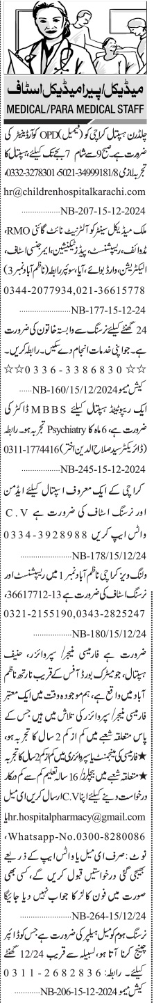 Vacant posts including midwife, rmo, mbbs doctor, sweeper, pharmacy manager, admin manager, receptionist, doctor, pharmacy supervisor, resident medical officer, helper, lady doctor, aya, emergency staff, paeds technician, nursing staff, nurse, opd coordinator, electrician and ward boy are announced in Hospital Clinic Karachi, karachi Sindh Pakistan as per 16 December 2024 advertisement in daily Jang Newspaper. Preferred Education is Matric, MBBS, Others, Bachelor, B Pharmacy, BA, DAE, Intermediate and B.com etc.